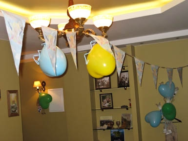 Šventės vietą taip pat puošėme vaikiškais bateliais, balionais, rūbeliais ir pliušiniais meškiukais, kuriems prieš tai užrišome žydrus kaspinėlius.