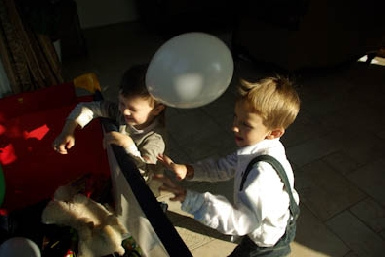 Po ramių ir "intelektualių" žaidimų iš Voliaus žaidimų dėžės(kaladėlės, memory ir domino) vaikams pasiūliau judresnių žaidimų su balionais. Vienas iš jų - kas greičiau nuneš balionus į krepšį. Kadangi gimtadienyje dalyvavo 4 vaikai, kiekvienam iš anksto pripučiau po skirtingų spalvų balionus(baltus, mėlynus, raudonus ir žalius). Visų spalvų balionų buvo po 4, nes juk šventėme 4-ąjį gimtadienį:). Vaikai išsirinko "savo" spalvą ir turėjo greičiausiai nunešti savo visus keturis balionus į kambario gale stovintį "krepšį" (išties tai buvo kūdikio lovelė:)).