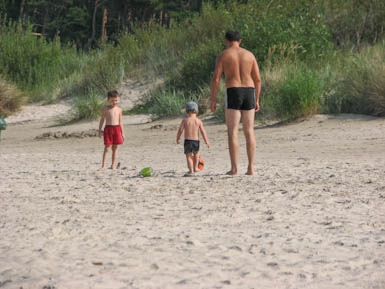 Jei jie jau prisikasė smėlyje, prisižaidė su smėliu ir priiiisimaudė, tai dar lieka kitų smagumų, pvz., smėlio futbolas ar tinklinis. Mačiau, kaip vienas tėvelis pasidarė iš šakaliukų dvejus vartus ir su berniuku varinėjosi kamuolį. Buvo gražu žiūrėti, kaip jis žaismingai žaidžia: ne stengiasi vaiką aplošti, nugalėti, bet tartum kartu, tartum lygiaverčiai žaidėjai spardo kamuolį. Vyras truputį sulėtina greitį, kad berniukui atrodytų, jog jis vikresnis ir geriau už tėtį moka žaisti:).