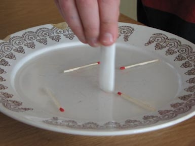 Kas sieja vaikus ir degtukus? Vaikai ir degtukai labai mėgsta saldumynus! Jei tuo netikite, išbandykite: gilioje lėkštėje su vandeniu iš degtukų sudėkite žvaigždės formą. Tada paimkite muilo gabaliuką ir įdėkite jį į lėkštės vidurį. Pamatysite, kad degtukai tuoj pat „spruks“ į lėkštės pakraštį. O dabar į lėkštės vidurį įdėkite gabalinio cukraus gabaliuką ir stebėkite – „smaguriai“ degtukai vėl sugrįš į lėkštės vidurį!