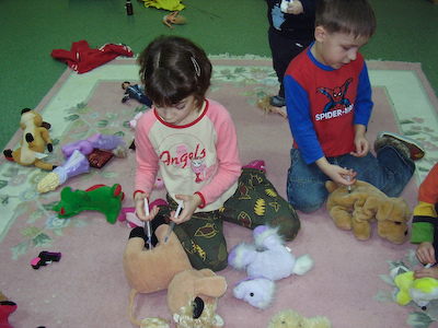 Paaugus tie rinkiniai tapo neįdomūs, todėl sugalvojau leisti pažaisti tikrais švirkštais ir įrankiais. Pririnkau tuščių buteliukų nuo vaistų, vitaminų, o taip pat ir krūvą pacientų, kuriuos galima gydyti.