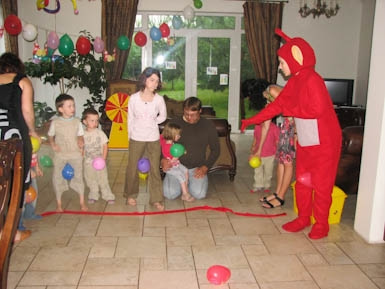 Susirinkus ir šiek tiek užkandus, laukėme siuprizo - teletabio. Atvažiavęs Po puolė žaisti smagius žaidimus, įtraukdamas ne tik vaikus, bet ir tėvelius. Teletabio programėlė truko 1 valandą. Kai su vaikais suvalgęs tortą jis išbėgo, netrukus išsiruošiau ir aš į ligoninę. O vaikučiai toliau linksminosi.