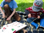 Vasaros atostogos - pats metas kūrybai namuose. "Puiki knyga giedrai dienai: žaidžiame lauke" buvo mūsų vedlys. Pavartę šią knygą, nusprendėme pasidaryti plaustą. Kad būtų smagiau, pasitiesėme kilimėlį lauke ir ėjome rintis šakų. Vėliau jas nuoširdžiai trumpinome, kad būtų vienodo ilgio. Dirbo ir septynmetis ir dvimeti...