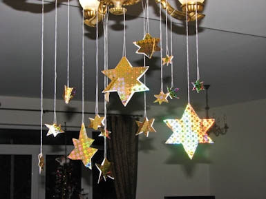 O idėja gimė labai paprastai. Į svečius užsuko draugai iš Londono, kurie, žinoma, turėjo ir dovanėlių. Visos jos buvo sudėtos į didelį "auksinį" maišą. Išėmus dovanėles, jis staiga išsiardė (atsiklijavo šonas), tuomet ir gimė man idėja jį kūrybingai panaudoti, mat tokio gražaus spalvoto popieriaus neturėjau... Su vaikais puolėme karpyti žvaigždėles, jas klijuoti (padariau dvipuses), o tada su siūlu tvirtinau prie šviestuvo. Buvo miela kartu su vaikučiais dirbti. Jie įsikvėpę prisidarė auksinių lėktuvėlių, nusipiešė žmogeliukų ir šauniai su jais žaidė.