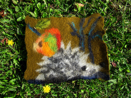 Vieną saulėtą šeštadienį pasikviečiau pažįstamą su vaikais. Mergaitės kuo greičiau norėjo kibti į darbą, bet mūsų berniukai išsilakstė žaisti, tačiau likus tik moteriškai kompanijai namie buvo ramiau. Susėdome ir pradėjome dėlioti rudeniškus paveiksliukus. Buvo smagu stebėti, kaip mergaitės su džiaugsmu kibo dėlioti savo sumanymus ant jau šiek tiek apvelto vilnonio pagrindo. Pradėjus velti norėjosi kuo greičiau pakelti plėvelę ir nors akies kampeliu pamatyti jau pradėjusį veltis piešinėlį, tačiau proceso nepaskubinsi. Iš pradžių apie 10 min. labai išvelniai, kad nepasislinktų piešinukas, jį trynėme per tinklelinę užuolaidą. Paskui uždengę ir susukę į pūslelinę plėvelę dar vėlėme apie pusvalandį. Tik paskui piešinėlį susukome į bambukinį kilimėlį ir pabaigėme velti. Jei neturėsite kantrybės, galite surizikuoti ir iškart velti su bambuku, bet tada sunku prognozuoti rezultatą, nes toks vėlimas labai greitas ir vilna stipriau slankioja.