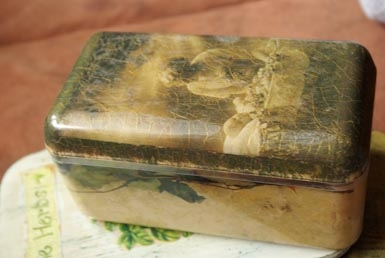 Ši paprasta permatoma plastmasinė saldainių dėžutė pasitarnavo man tuo, kad su ja išbandžiau atvirkštinį dekupažą. Taigi, apie viską iš pradžių: visų pirma dangtelį nulakavau dvikomponenčiu laku (pradžioje Nr 1, o po to Nr 2). Išdžiūvus lakui ir atsiradus įtrūkimams, juos įtryniau auksine patina. Na, ir galiausiai, dangtelio vidų išklijavau dekupažo popieriumi (tai galima padaryti ir su kitu plonesniu popieriumi prieš tai jį pamirkius vandenyje). Pačios dėžutės vidų taip pat išklijavau panašiu dekupažo popieriumi. Dugną ir likusius tarpus nudažiau panašios spalvos akriliniais dažais. Štai darbas ir baigtas!