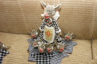 Žiūrėdama į vaikišką knygelę su pasakų veikėjais, pasigaminau iškarpą. Galima naudoti įvairias medžiagėles iš nereikalingų rūbų. Susiuvau su mašina (galima siūti ir rankomis, tik ilgiau užtruks). Akis išpaišiau ant lino su tekstiliniais dažais (galima naudoti ir akrilinius ar aliejinius). Nupaišytas akis užlyginau su lygintuvu ir prisiuvau prie snukučio. Ragus susukau iš baltos medžiagos ir apsukau juos siūlais, kad laikytųsi forma.