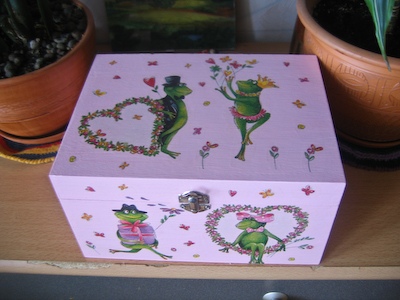 Ši dėžutė dekoruota dekupažo būdu. Iš pradžių dėžutę nudažome akriliniais rožiniais dažais ir palaukiame kol išdžius. Tuomet išsikerpame iš servetėlės varlytes, nuplėšiame du nereikalingus servetėlės sluoksnius ir klijuojame jas ant dėžutės dekupažui skirtais klijais. Po to visą dėžutę kelis kartus nulakuojame akriliniu laku. Pabaigusios darbelį nepamirškite įdėti meilės laiškelio!
