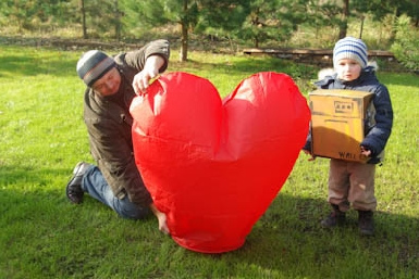 Gimtadienio pabaigoje visi išėjome į lauką, kad galėtume atsisveikinti su geruoju, darbščiuoju robotuku Voliumi ir paleidome į dangų Voliaus širdį:). Tokią širdelę pirkau specialioje vaikų parduotuvėje BIG’e(II-ame aukšte). Širdelės viduje yra deglas, kurį uždegus, popierinė širdelė pakyla į orą ir nuskrenda.