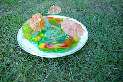 Jums reikės: trijų spalvų želė, guminukų.