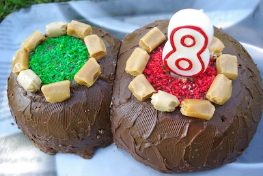 Aštuonetą formuokite masę dėdamos į skirtingo dydžio dubenėlius, prieš tai įtiesus maistinę plėvelę. Gerai suspauskite ir palikite maždaug dvylikai valandų, kad sustingtų. Po to tortą išverskite ir aptepkite šokoladiniu kremu. Puoškite pabarstais.